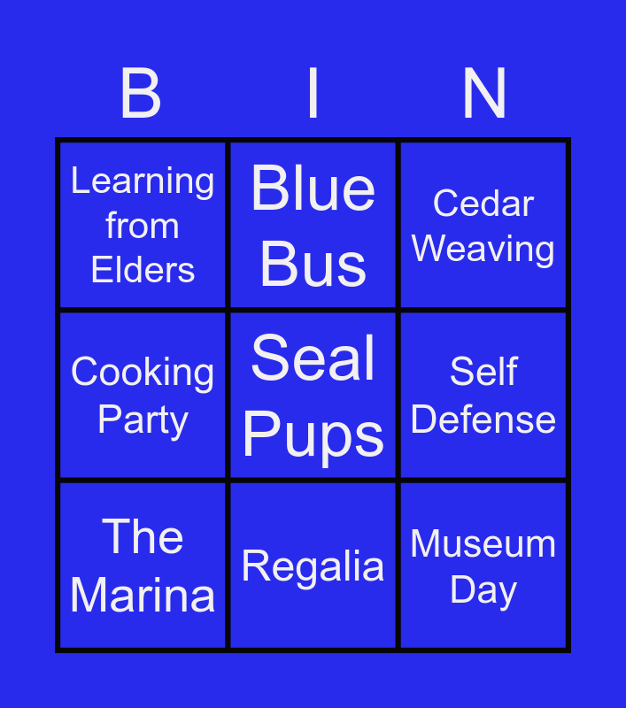 This bingo card has 33 words: Youth Centre, Band Office, Chief and Council, Community Garden, Canoe, The Marina, Seal Pups, Bear Sighting, Blue Bus, Band Van, Regalia, Cedar Weaving, Reserve #2, Invasive Removal, H.A.T. Hats, Zoom Check-Ins, Snack Time, Sc’ianew, Sooke Potholes, Suncatchers, Recycling Day, Summer Camp-Out, Learning from Elders, Sage, Plant Walk, Fry Bread, Cooking Party, Museum Day, Self Defense, Swimming at Pool, Archaeology on the Beach, Drum Group and Huy ch q’u / Hy’chka / HÍSWKE.