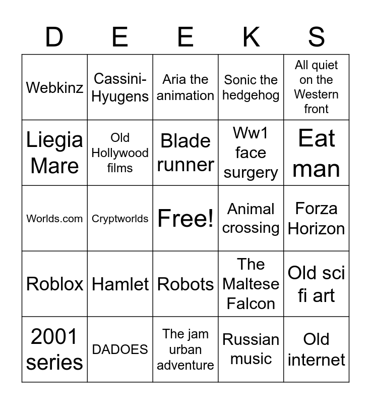 This bingo card has a free space and 24 words: Hamlet, DADOES, Blade runner, 2001 series, All quiet on the Western front, Webkinz, Liegia Mare, Cassini-Hyugens, Animal crossing, Robots, Ww1 face surgery, Worlds.com, The Maltese Falcon, Old sci fi art, Old Hollywood films, Russian music, Forza Horizon, Aria the animation, Eat man, Cryptworlds, Old internet, Roblox, Sonic the hedgehog and The jam urban adventure.