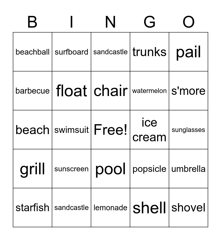 This bingo card has a free space and 31 words: lemonade, towel, swimsuit, flippers, beachball, sandcastle, float, popsicle, ice cream, shell, sunglasses, shovel, sprinkler, snow cone, s'more, crab, umbrella, sunscreen, grill, pool, pail, fan, starfish, surfboard, watermelon, barbecue, trunks, beach, sandcastle, chair and hat.