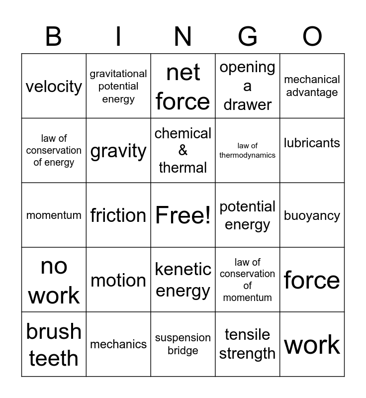 This bingo card has a free space and 24 words: motion, mechanics, chemical & thermal, brush teeth, mechanical advantage, velocity, law of conservation of energy, gravitational potential energy, potential energy, kenetic energy, law of thermodynamics, momentum, law of conservation of momentum, force, gravity, tensile strength, buoyancy, net force, lubricants, friction, work, no work, opening a drawer and suspension bridge.