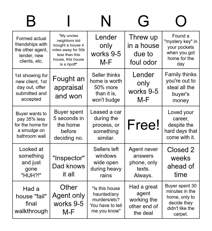 This bingo card has a free space and 24 words: "Inspector" Dad knows it all, Other Agent only works 9-5 M-F, Seller thinks home is worth 50% more than it is, won't budge, Had a house "fail" final walkthrough, Found a "mystery key" in your pockets when you got home for the day, Formed actual friendships with the other agent, lender, new clients, etc., 1st showing for new client, 1st day out, offer submitted and accepted, "My uncles neighbors kid bought a house 4 miles away for 50k less than this house, this house is a ripoff", Free!, Sellers left windows wide open during heavy rains, Lender only works 9-5 M-F, Buyer wants to pay 35% less for the home for a smudge on bathroom wall, Agent never answers phone, only texts. Always., Closed 2 weeks ahead of time, Fought an appraisal and won, Had a great agent working the other end of the deal, Loved your career, despite the hard days that come with it., Lender only works 9-5 M-F, Family thinks you're out to steal all the buyer's money, Buyer spent 5 seconds in the home before deciding no., Buyer spent 30 minutes in the home, only to decide they didn't like the carpet., Looked at something and just gone "HUH?!", Threw up in a house due to foul odor and "Is this house haunted/any murders/etc? You have to tell me you know".