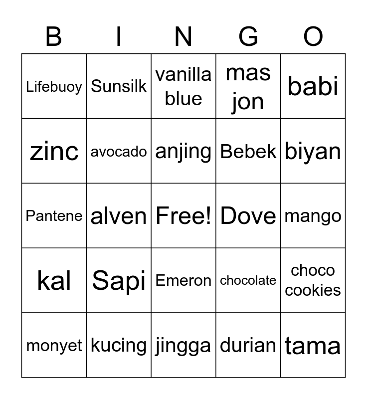 This bingo card has a free space and 24 words: Sapi, kucing, anjing, monyet, babi, Lifebuoy, zinc, Sunsilk, Dove, Emeron, Bebek, Pantene, chocolate, choco cookies, avocado, durian, mango, vanilla blue, biyan, alven, tama, kal, mas jon and jingga.