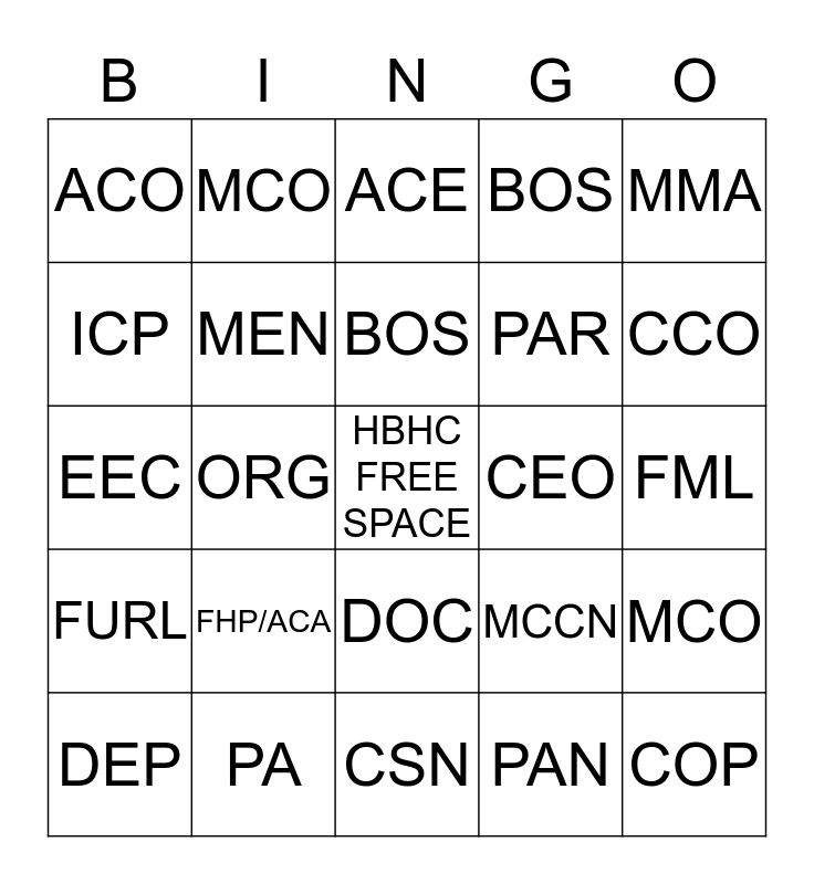 This bingo card has a free space and 24 words: FHP/ACA, PA, BOS, DEP, MMA, ACO, ICP, MCO, CEO, DOC, PAR, EEC, MCCN, MCO, MEN, PAN, FML, ACE, CCO, ORG, COP, FURL, BOS and CSN.