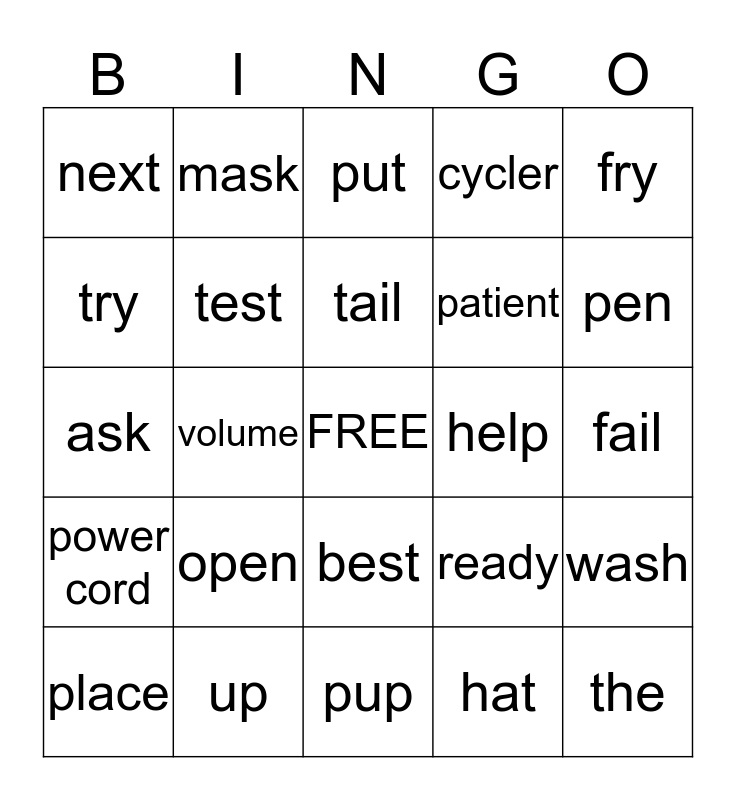 This bingo card has a free space and 24 words: open, up, tail, place, fry, next, try, mask, help, best, patient, ask, ready, wash, test, hat, fail, put, pen, volume, the, power cord, cycler and pup.