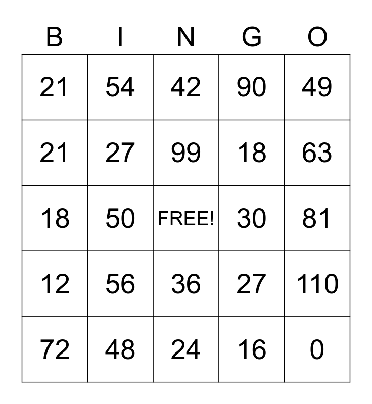 This bingo card has a free space and 27 words: 27, 60, 18, 24, 21, 42, 54, 12, 30, 110, 18, 90, 72, 48, 63, 64, 27, 99, 56, 21, 81, 16, 50, 0, 36, 49 and 32.