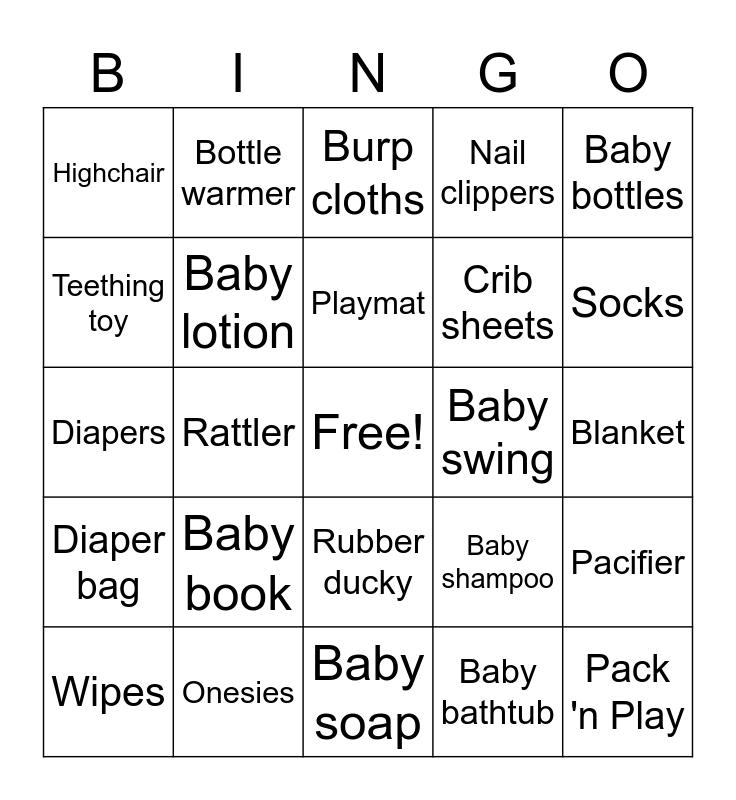 This bingo card has a free space and 24 words: Baby book, Onesies, Playmat, Wipes, Baby bottles, Highchair, Teething toy, Bottle warmer, Baby swing, Rubber ducky, Crib sheets, Diapers, Baby shampoo, Pacifier, Baby lotion, Baby bathtub, Blanket, Burp cloths, Socks, Rattler, Pack 'n Play, Diaper bag, Nail clippers and Baby soap.