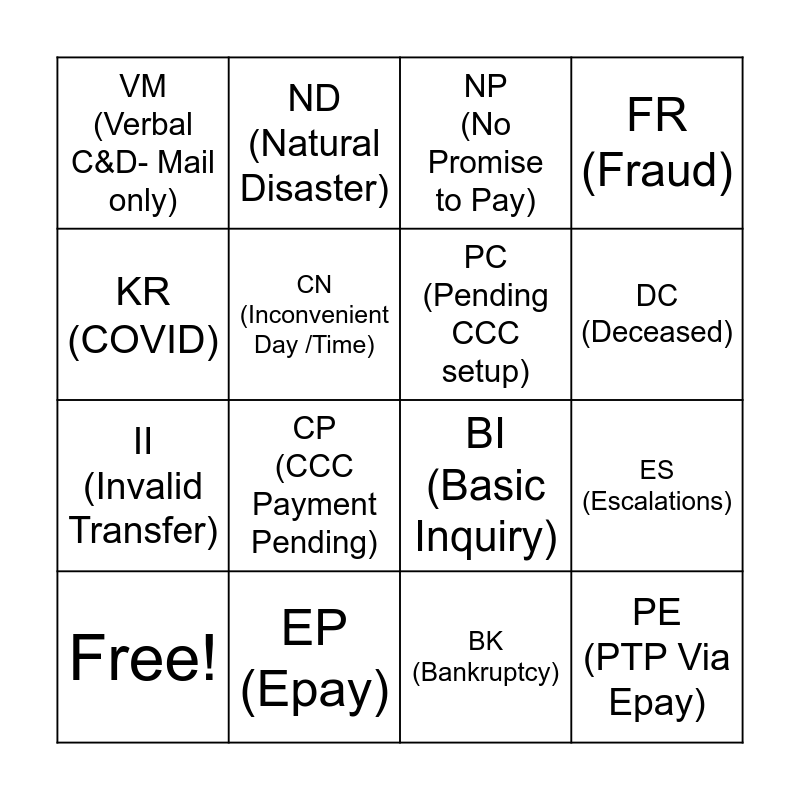 This bingo card has 16 words: Free!, EP (Epay), NP (No Promise to Pay), FR (Fraud), KR (COVID), ND (Natural Disaster), BI (Basic Inquiry), ES (Escalations), VM (Verbal C&D- Mail only), CN (Inconvenient Day /Time), BK (Bankruptcy), DC (Deceased), II (Invalid Transfer), CP (CCC Payment Pending), PC (Pending CCC setup) and PE (PTP Via Epay).