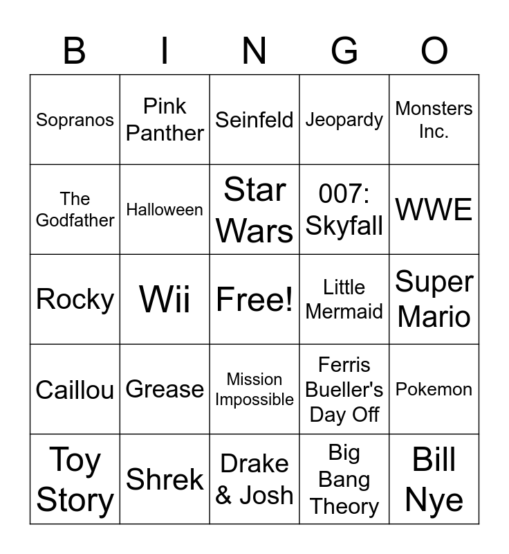 This bingo card has a free space and 24 words: Grease, Shrek, Star Wars, Toy Story, Monsters Inc., Sopranos, The Godfather, Pink Panther, Little Mermaid, Mission Impossible, 007: Skyfall, Rocky, Ferris Bueller's Day Off, Pokemon, Halloween, Big Bang Theory, Super Mario, Seinfeld, WWE, Wii, Bill Nye, Caillou, Jeopardy and Drake & Josh.