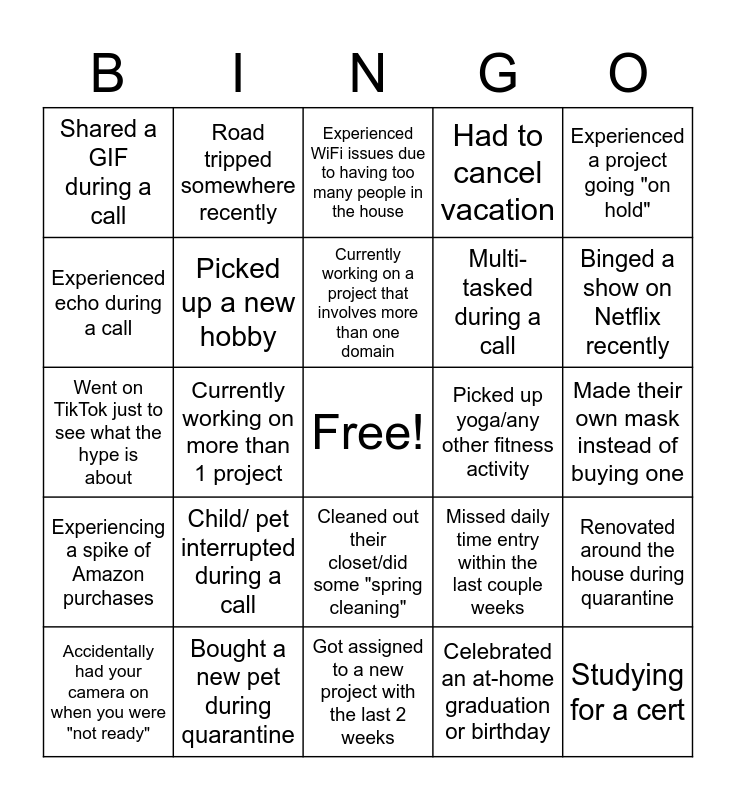 This bingo card has a free space and 24 words: Child/ pet interrupted during a call, Bought a new pet during quarantine, Currently working on a project that involves more than one domain, Accidentally had your camera on when you were "not ready", Experienced a project going "on hold", Shared a GIF during a call, Experienced echo during a call, Road tripped somewhere recently, Picked up yoga/any other fitness activity, Cleaned out their closet/did some "spring cleaning", Multi-tasked during a call, Went on TikTok just to see what the hype is about, Missed daily time entry within the last couple weeks, Renovated around the house during quarantine, Picked up a new hobby, Celebrated an at-home graduation or birthday, Made their own mask instead of buying one, Experienced WiFi issues due to having too many people in the house, Binged a show on Netflix recently, Currently working on more than 1 project, Studying for a cert, Experiencing a spike of Amazon purchases, Had to cancel vacation and Got assigned to a new project with the last 2 weeks.