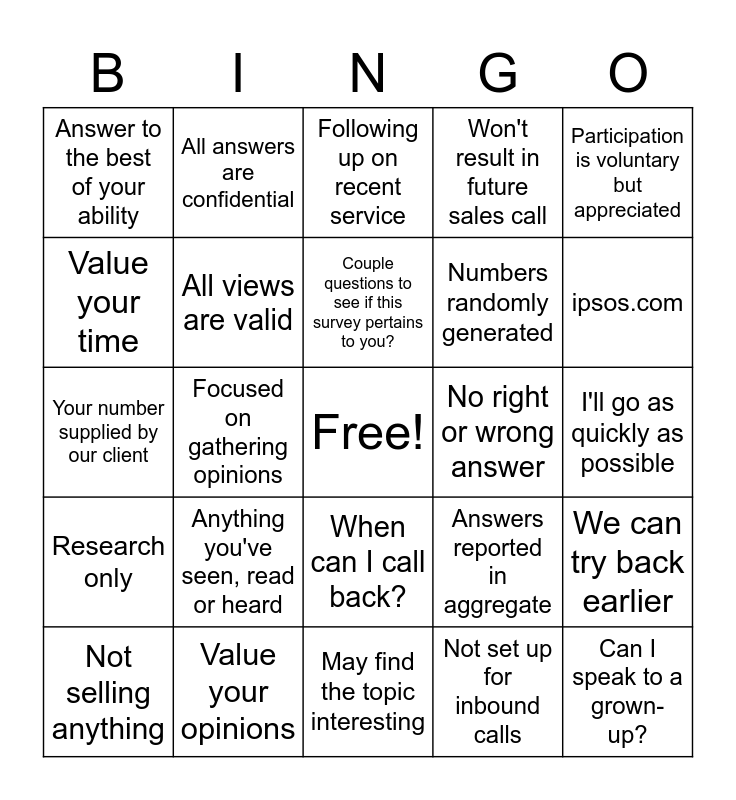This bingo card has a free space and 26 words: When can I call back?, Not set up for inbound calls, Couple questions to see if this survey pertains to you?, Value your opinions, Participation is voluntary but appreciated, Answer to the best of your ability, Value your time, All answers are confidential, I'll go as quickly as possible, Answers reported in aggregate, Numbers randomly generated, Your number supplied by our client, We can try back earlier, Not selling anything, Focused on gathering opinions, Not a telemarketer, Won't result in future sales call, Research only, Following up on recent service, Can I speak to a grown-up?, ipsos.com, May find the topic interesting, No right or wrong answer, Anything you've seen, read or heard, All views are valid and Anyone else to participate?.