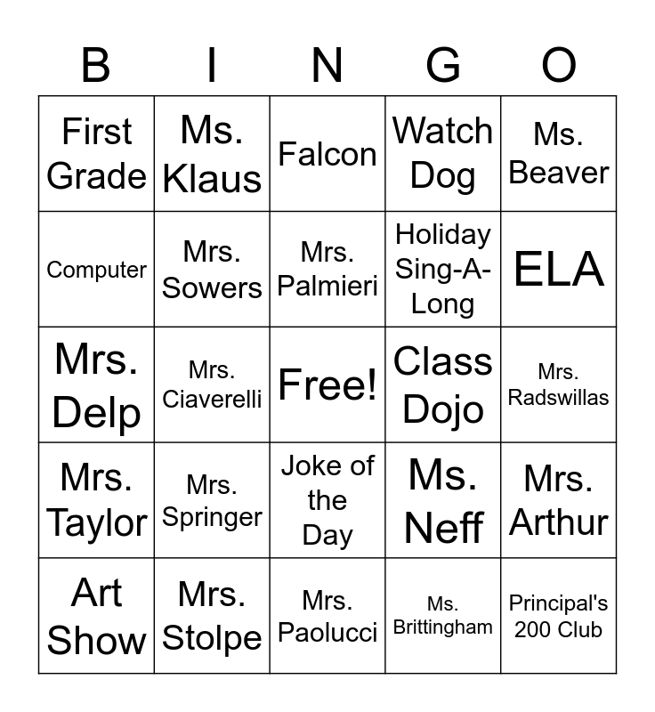 This bingo card has a free space and 80 words: Be Safe, Be Responsible, Falcon, 100 Book Club, Xtra Math, Encore, Dr. Jones, Book Fair, Field Day, Clubs, Car Line, Lunch, Watch Dog, First Grade, Health, Computer, Music, Mrs. Springer, Mrs. Ottaviano, Mrs. Radswillas, Mrs. Campbell, Ms. Beaver, Mrs. Delp, Mrs. Palmieri, Mrs. Sowers, Mrs. Natale, Mrs. Santangelo, Be Positive, Ringing Rocks, Math, ELA, Playground, Mrs. Paolucci, STEAM Day, Art Show, Class Dojo, Morning Meeting, PTA, Pottsgrove, Principal's 200 Club, Kindergarten, School Bus, Gym, Art, Mrs. Winnick, Ms. Klaus, Mr. Weber, Mrs. Robinson, Mrs. Adornetto, Mrs. Bradley, Mrs. Arthur, Mrs. Ciaverelli, Ms. Neff, Dr. Kiley, Be Respectful, Science, Social Studies, Books, Golden Ticket, Joke of the Day, Holiday Sing-A-Long, Spirit Day, Backpack, Guest Readers, Book of the Month, Friends, Second Grade, Field Trip, Library, Mrs. Benedict, Mrs. Taylor, Mrs. Stolpe, Mrs. Bechtold, Mrs. Stutzman, Mrs. Hill, Mrs. Randle, Ms. Brittingham, Mrs. Acra, Mrs. Quigley and Mrs. Roberts.