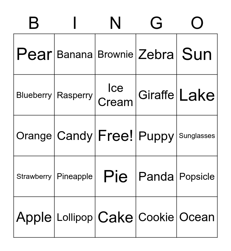 This bingo card has a free space and 24 words: Apple, Pineapple, Ice Cream, Cookie, Sun, Pear, Banana, Brownie, Puppy, Sunglasses, Orange, Rasperry, Panda, Popsicle, Blueberry, Lollipop, Cake, Zebra, Lake, Strawberry, Candy, Pie, Giraffe and Ocean.