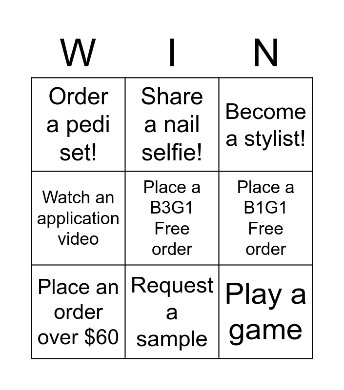 This bingo card has a free space and 11 words: Book a party, Request a sample, Play a game, Place an order over $60, Share a nail selfie!, Become a stylist!, Place a B1G1 Free order, Like my VIP page, Watch an application video, Order a pedi set! and Order an awareness shade!.