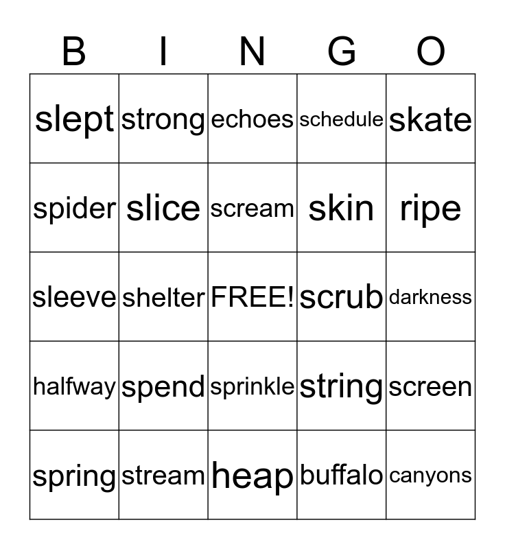 This bingo card has a free space and 24 words: spend, stream, scream, spring, skate, slept, spider, strong, scrub, sprinkle, skin, sleeve, string, screen, slice, buffalo, darkness, echoes, ripe, shelter, canyons, halfway, schedule and heap.