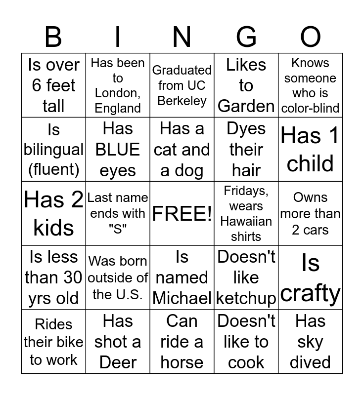 This bingo card has a free space and 24 words: Was born outside of the U.S., Has shot a Deer, Has a cat and a dog, Rides their bike to work, Knows someone who is color-blind, Is over 6 feet tall, Is bilingual (fluent), Has been to London, England, Fridays, wears Hawaiian shirts, Is named Michael, Dyes their hair, Has 2 kids, Doesn't like ketchup, Is crafty, Has BLUE eyes, Doesn't like to cook, Owns more than 2 cars, Graduated from UC Berkeley, Has 1 child, Last name ends with "S", Has sky dived, Is less than 30 yrs old, Likes to Garden and Can ride a horse.