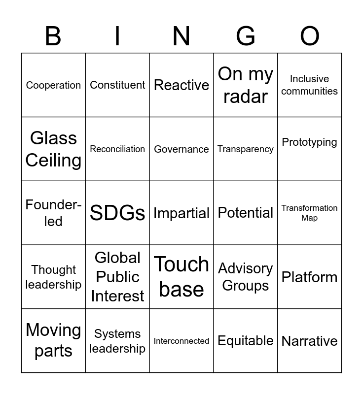 This bingo card has 120 words: Thinking outside of the box, Circle back, Seat at the table, Stakeholder, Socialize, Value add, On my radar, Manage expectations, Platform, Loop in, Cast a wider net, blockchain, Air traffic control, leverage, disconnect, Take offline, Touch base, Proactive, Bandwidth, innovative, Moving parts, Reactive, pain point, Fourth Industrial Revolution, pipeline, Thought leadership, Systems leadership, Solution-oriented, Changemaker, Sustainable, Equitable, SDGs, Governance, Leadership, Responsive, Initiatives, Coalitions, Curation, Mobilize, Cultivate, Public-Private Collaboration, Authenticity, Palenterie, Dynamic, Engagement, Community Manager, PEM, Potential, Expertise, Impact Investing, Scalable, Impact-Oriented, Advisory Groups, Monopolize, Galvanize, Pivotal, Human-centered, Sessions, Strawdog, Constituent, Resiliency, Amplify, Discourse, Low hanging fruit, High Bar, Glass Ceiling, Shaping the Agenda, Narrative, Key Issues, Create Value, Founder-led, Social Gastronomy, Social Entrepreneur, Political Entrepreneurship, Intersection, Agile, Transparency, Comprehensive, Impartial, Global Public Interest, Cooperation, Collaboration, Global Challenges, Uniquely Positioned, Champion, Integration, Interconnected, Compliance, Complex Challenges, Partner Engagement, Global Future Council, Transformation Map, Driving Dialogue, Solution Building, Policy-making, A tipping point, Grassroots movement, Inclusive communities, Pluralism, Global Footprint, Resource Management, Network, Hubs, White Badge, Blue Badge, Reconciliation, Magic Mountain, Public Engagement, Deep dive, CRM, Circle up, Design thinking, Cohort, Managing Board, Prototyping, Post Financial Crisis- World, Responsible Capitalism, Community of Chairpersons, Family Business Community and Session Responsible.