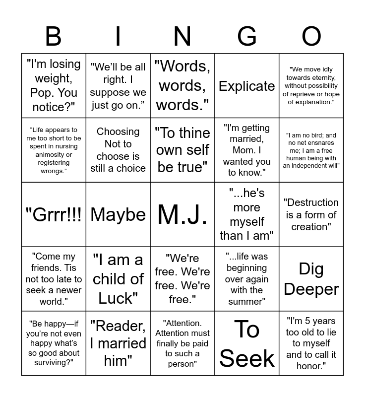 This bingo card has a free space and 34 words: To Strive, To Seek, To Find, Not To Yield, "Come my friends. Tis not too late to seek a newer world.", Choosing Not to choose is still a choice, "We move idly towards eternity, without possibility of reprieve or hope of explanation.", "Be happy—if you’re not even happy what’s so good about surviving?", "We’ll be all right. I suppose we just go on.”, "It's all questions", "To thine own self be true", "Words, words, words.", Adieu, Remember me!, Ay, there's the rub., "...he's more myself than I am", "I am no bird; and no net ensnares me; I am a free human being with an independent will", "Reader, I married him", "Grrr!!!, "I am a child of Luck", "...life was beginning over again with the summer", "We're free. We're free. We're free.", "I know who I am, kid", "I'm losing weight, Pop. You notice?", "Destruction is a form of creation", "Attention. Attention must finally be paid to such a person", "I'm 5 years too old to lie to myself and to call it honor.", Explicate, "YOU HAVE BEEN WARNED!", "I'm getting married, Mom. I wanted you to know.", “Life appears to me too short to be spent in nursing animosity or registering wrongs.”, “Conventionality is not morality”, Maybe, Dig Deeper and Choosing a college is stressful..
