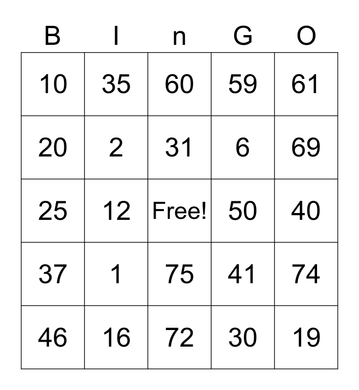 This bingo card has a free space and 24 words: 1, 16, 31, 46, 61, 10, 20, 35, 50, 75, 6, 25, 41, 74, 2, 30, 40, 60, 69, 12, 19, 37, 59 and 72.