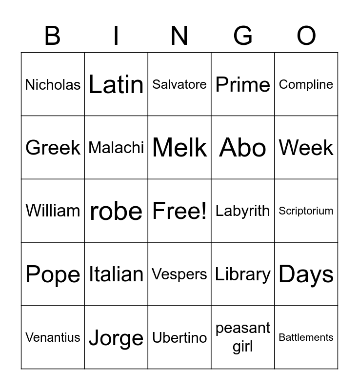 This bingo card has a free space and 24 words: Italian, Jorge, Melk, Venantius, Compline, Nicholas, Greek, Latin, Labyrith, Vespers, Abo, William, Library, Days, Malachi, peasant girl, Scriptorium, Salvatore, Week, robe, Battlements, Pope, Prime and Ubertino.