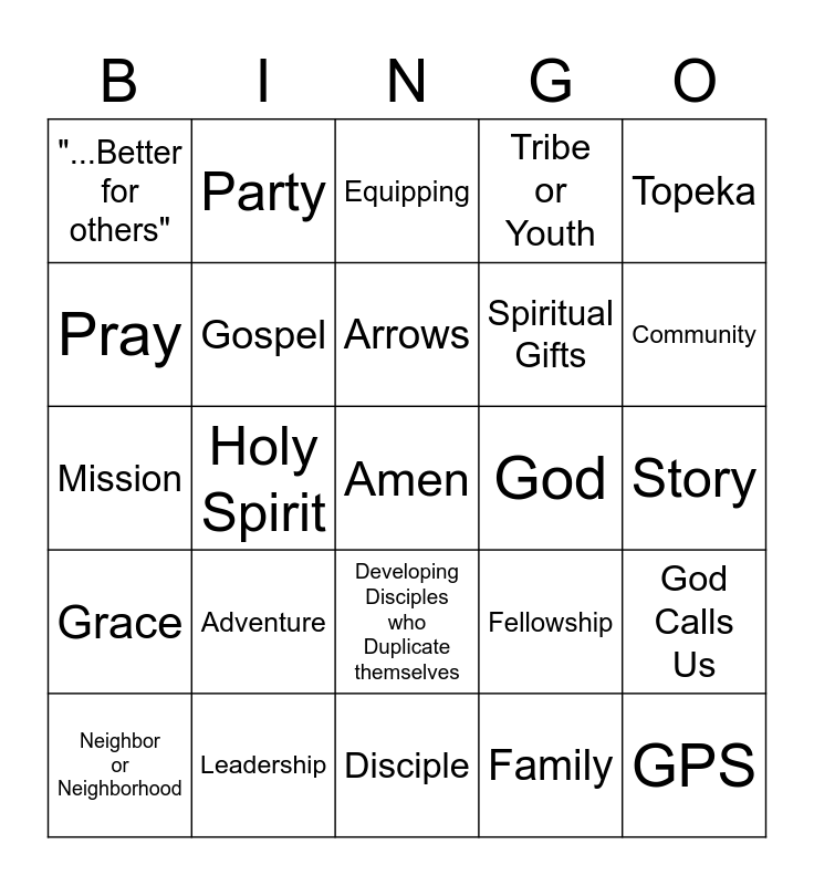 This bingo card has a free space and 29 words: Neighbor or Neighborhood, Circle of influence, Holy Spirit, Blessed to be a blessing, "...Better for others", Equipping, Gospel, Adventure, God, Leadership, Story, GPS, Disciple, Family, Community, Love, Developing Disciples who Duplicate themselves, Grace, Topeka, Mission, Fellowship, Any mention of Triplets, Spiritual Gifts, Pray, Tribe or Youth, Party, God Calls Us, Arrows and Grace Group.
