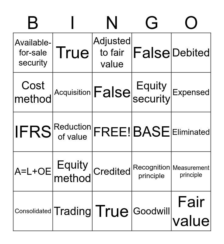 This bingo card has a free space and 24 words: Equity method, Trading, False, Consolidated, Debited, Available-for-sale security, Cost method, True, BASE, Credited, Equity security, IFRS, Recognition principle, Measurement principle, Acquisition, Goodwill, Eliminated, Adjusted to fair value, Expensed, Reduction of value, Fair value, A=L+OE, False and True.