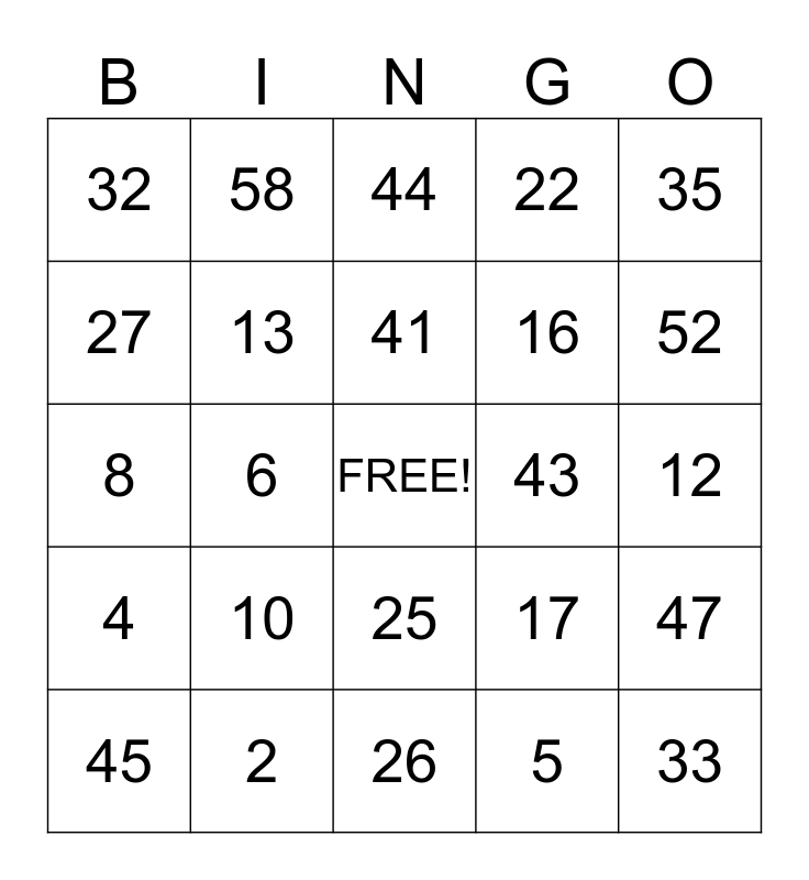 This bingo card has a free space and 60 words: 1, 2, 3, 4, 5, 11, 13, 15, 16, 19, 22, 24, 27, 28, 30, 32, 33, 35, 38, 41, 43, 44, 45, 47, 48, 49, 50, 51, 52, 53, 54, 55, 56, 57, 58, 59, 60, 6, 7, 8, 9, 10, 12, 14, 17, 18, 20, 21, 23, 25, 26, 29, 31, 34, 36, 37, 39, 40, 42 and 46.
