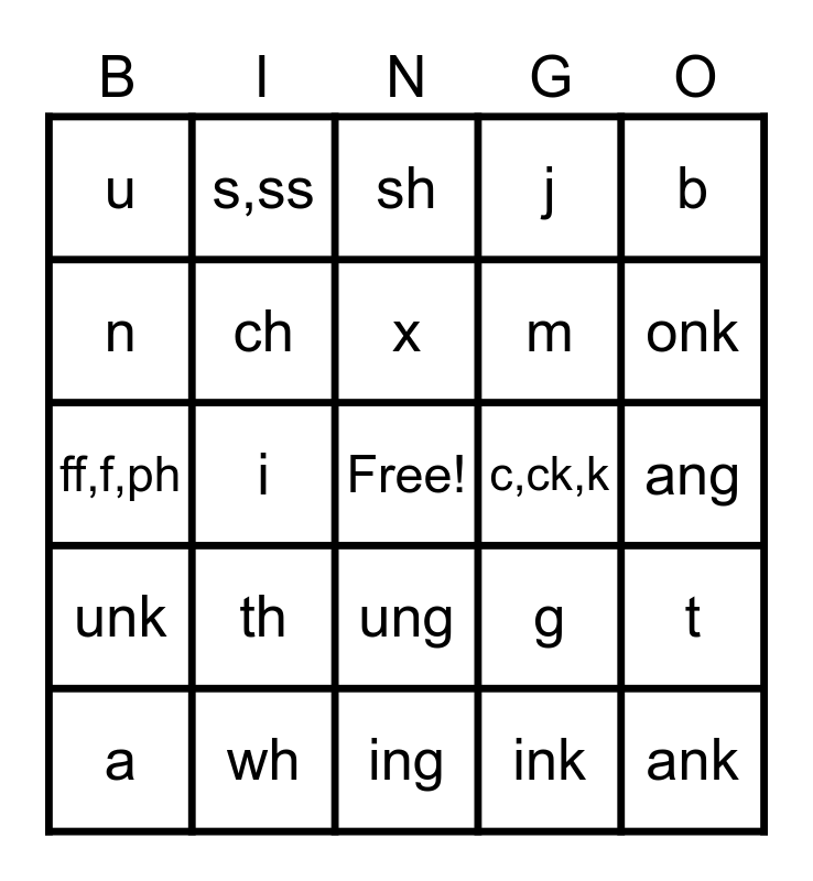 This bingo card has a free space and 29 words: a, e, i, o, u, sh, ch, th, c,ck,k, wh, ang, ank, ing, ink, onk, ong, ung, unk, b, ff,f,ph, g, h, m, n, j, s,ss, t, x and s,z.