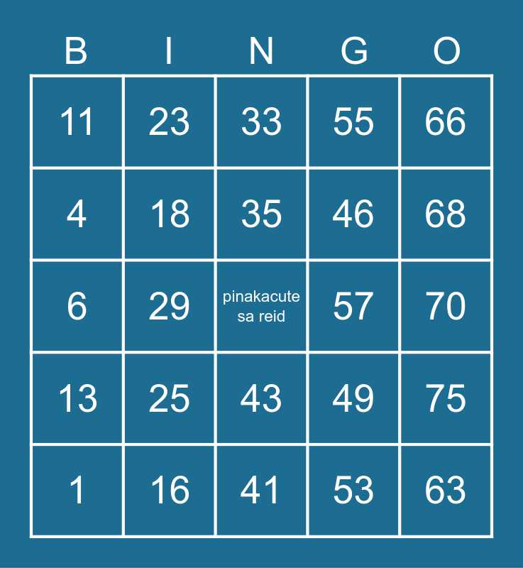 This bingo card has a free space and 24 words: 1, 25, 35, 53, 66, 11, 23, 33, 57, 70, 6, 18, 49, 75, 4, 16, 41, 55, 68, 13, 29, 43, 46 and 63.