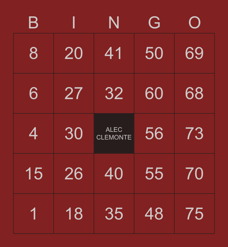 This bingo card has a free space and 24 words: 1, 26, 32, 48, 69, 8, 20, 41, 56, 73, 4, 27, 55, 70, 6, 18, 35, 50, 68, 15, 30, 40, 60 and 75.