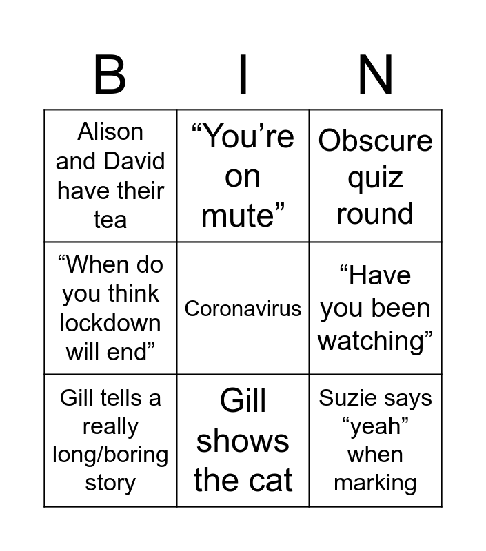 This bingo card has a free space and 16 words: Andy Jones pipes up, Dominic cummings, Obscure quiz round, Alison and David have their tea, The mcgees win, “You’re on mute”, “What’ve you had for tea”, Neil says “quiz”, Suzie says “yeah” when marking, “Have you been watching”, Andrew gets a new drink, “When do you think lockdown will end”, Face masks, Gill shows the cat, Gill tells a really long/boring story and Walking/ingleborough.