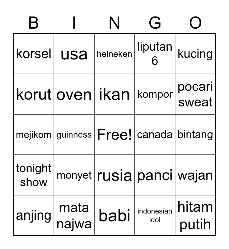 This bingo card has a free space and 25 words: monyet, babi, ikan, anjing, kucing, korsel, korut, usa, canada, rusia, kompor, mejikom, panci, wajan, oven, bear brand, bintang, heineken, pocari sweat, guinness, hitam putih, mata najwa, tonight show, liputan 6 and indonesian idol.