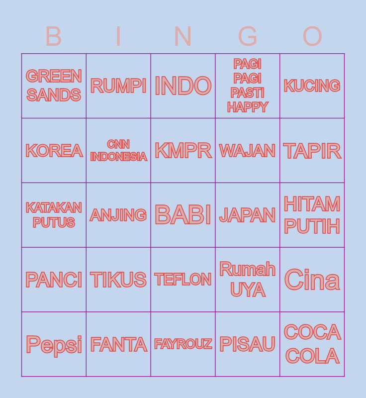 This bingo card has a free space and 24 words: TIKUS, FANTA, KMPR, Pepsi, KUCING, GREEN SANDS, KOREA, RUMPI, JAPAN, TEFLON, WAJAN, KATAKAN PUTUS, Rumah UYA, Cina, CNN INDONESIA, PISAU, HITAM PUTIH, INDO, TAPIR, ANJING, COCA COLA, PANCI, PAGI PAGI PASTI HAPPY and FAYROUZ.