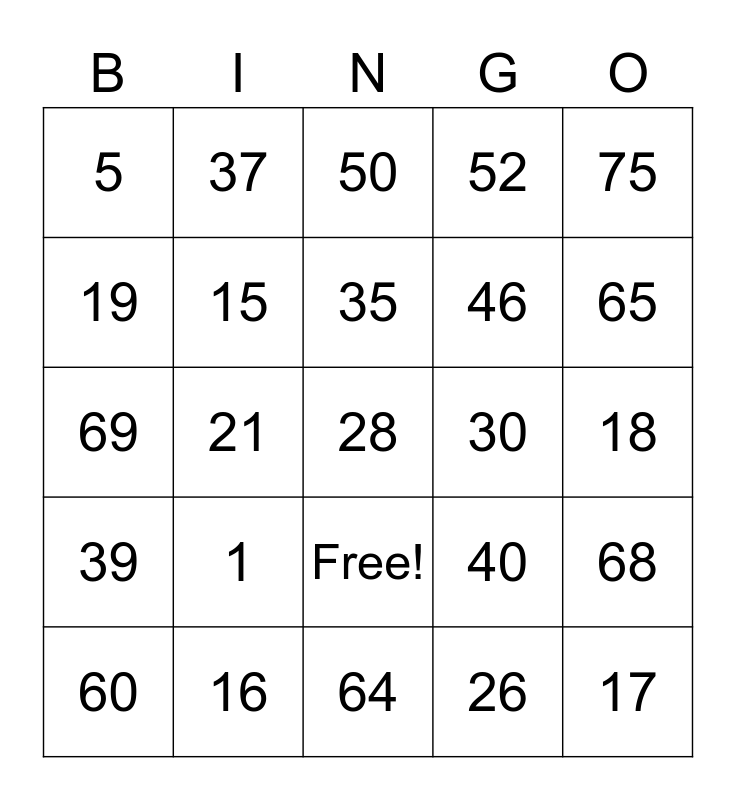 This bingo card has a free space and 24 words: 1, 16, 35, 60, 75, 5, 19, 37, 30, Free!, 46, 69, 40, 68, 15, 26, 18, 50, 65, 21, 17, 39, 52 and 64.