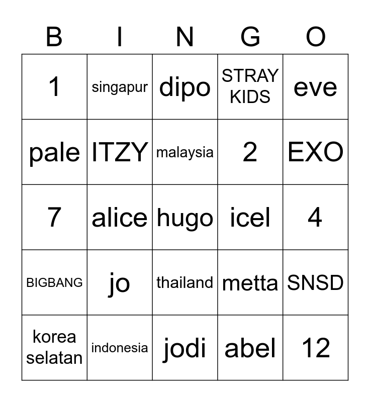 This bingo card has a free space and 24 words: jo, indonesia, malaysia, korea selatan, eve, 1, pale, singapur, icel, thailand, 2, 7, metta, SNSD, ITZY, abel, 4, dipo, EXO, alice, 12, BIGBANG, STRAY KIDS and jodi.
