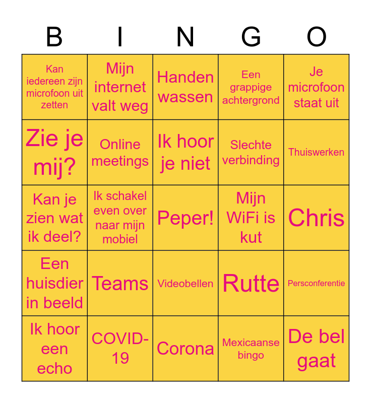 This bingo card has a free space and 24 words: Teams, COVID-19, Ik hoor je niet, Ik hoor een echo, Je microfoon staat uit, Kan iedereen zijn microfoon uit zetten, Zie je mij?, Mijn internet valt weg, Mijn WiFi is kut, Videobellen, Slechte verbinding, Kan je zien wat ik deel?, Rutte, Persconferentie, Online meetings, Mexicaanse bingo, Chris, Handen wassen, Thuiswerken, Ik schakel even over naar mijn mobiel, De bel gaat, Een huisdier in beeld, Een grappige achtergrond and Corona.