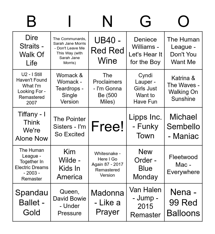 This bingo card has a free space and 100 words: Eurythmics - Sweet Dreams (Are Made of This) - Remastered, TOTO - Africa, Michael Sembello - Maniac, Tears For Fears - Everybody Wants To Rule The World, a-ha - Take on Me, Kenny Loggins - Footloose - From "Footloose" Soundtrack, Journey - Don't Stop Believin', Men At Work - Down Under, Soft Cell - Tainted Love, Michael Jackson - Beat It - Single Version, Daryl Hall & John Oates - You Make My Dreams, Bryan Adams - Summer Of '69, Whitney Houston - I Wanna Dance with Somebody (Who Loves Me), Queen, David Bowie - Under Pressure, Simple Minds - Don't You (Forget About Me), Elton John - I'm Still Standing, Cyndi Lauper - Girls Just Want to Have Fun, Starship - We Built This City, Bon Jovi - You Give Love A Bad Name, Bonnie Tyler - Holding Out for a Hero - From "Footloose" Soundtrack, Belinda Carlisle - Heaven Is a Place on Earth, Kim Carnes - Bette Davis Eyes, Rick Astley - Never Gonna Give You Up, Wham! - Wake Me Up Before You Go-Go, The Buggles - Video Killed The Radio Star, Lipps Inc. - Funky Town, The Human League - Don't You Want Me, New Order - Blue Monday, Eric Carmen - Hungry Eyes, Dexys Midnight Runners - Come On Eileen, The Pointer Sisters - I'm So Excited, Dire Straits - Walk Of Life, Culture Club - Karma Chameleon - Remastered, Philip Bailey, Phil Collins - Easy Lover, Van Halen - Jump - 2015 Remaster, The Proclaimers - I'm Gonna Be (500 Miles), Fleetwood Mac - Everywhere, Taylor Dayne - Tell It to My Heart, Matthew Wilder - Break My Stride, Billy Joel - Uptown Girl, Phil Collins - You Can't Hurry Love, Michael Jackson - Thriller - 2003 Edit, Tiffany - I Think We're Alone Now, Kenny Loggins - Danger Zone - From "Top Gun" Original Soundtrack, Katrina & The Waves - Walking On Sunshine, UB40 - Red Red Wine, Duran Duran - Hungry Like the Wolf - 2009 Remaster, Survivor - Eye of the Tiger, Depeche Mode - Just Can't Get Enough, Madonna - Like a Prayer, Billy Idol - White Wedding, Kool & The Gang - Get Down On It - Single Version, George Harrison - Got My Mind Set On You - 2004 Mix, Lionel Richie - All Night Long (All Night), Paul Simon - You Can Call Me Al, George Michael - Faith - Remastered, Pet Shop Boys - West End Girls - 2001 Remaster, Men Without Hats - The Safety Dance, Madonna - Like a Virgin, Deniece Williams - Let's Hear It for the Boy, Irene Cara - What A Feeling, The Cure - Close To Me, Don Henley - The Boys Of Summer, INXS - Need You Tonight, Dead Or Alive - You Spin Me Round (Like a Record), Cameo - Word Up, Prince - Kiss, Fine Young Cannibals - She Drives Me Crazy, Huey Lewis & The News - The Power Of Love, The Police - Every Little Thing She Does Is Magic - Remastered 2003, Madness - Our House, Kim Wilde - Kids In America, Tina Turner - What's Love Got to Do with It, The Rolling Stones - Start Me Up - 2009 Re-Mastered Digital Version, Genesis - Invisible Touch - Remastered, Run–D.M.C., Aerosmith - Walk This Way (feat. Aerosmith), Spandau Ballet - True - Single Edit, U2 - I Still Haven't Found What I'm Looking For - Remastered 2007, Frankie Goes To Hollywood - Relax - 7" Mix, The B-52's - Love Shack, Steve Winwood - Higher Love - Single Version, Nena - 99 Red Balloons, Chaka Khan - Ain't Nobody, Whitesnake - Here I Go Again 87 - 2017 Remastered Version, Prince - Raspberry Beret, The Communards, Sarah Jane Morris - Don't Leave Me This Way (with Sarah Jane Morris), ABBA - Super Trouper, Erasure - A Little Respect, Luther Vandross - Never Too Much, The Human League - Together In Electric Dreams - 2003 - Remaster, Marvin Gaye - Sexual Healing, Joy Division - Love Will Tear Us Apart, Four Tops - Loco in Acapulco, Spandau Ballet - Gold, Womack & Womack - Teardrops - Single Version, Boy Meets Girl - Waiting for a Star to Fall, Diana Ross - Chain Reaction, The Stranglers - Golden Brown, Tight Fit - The Lion Sleeps Tonight and Huey Lewis & The News - Hip To Be Square.