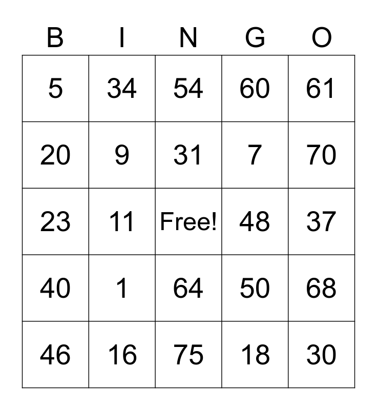 This bingo card has a free space and 24 words: 1, 16, 31, 46, 61, 5, 20, 34, 48, 64, 7, 23, 50, 68, 9, 18, 37, 54, 70, 11, 30, 40, 60 and 75.