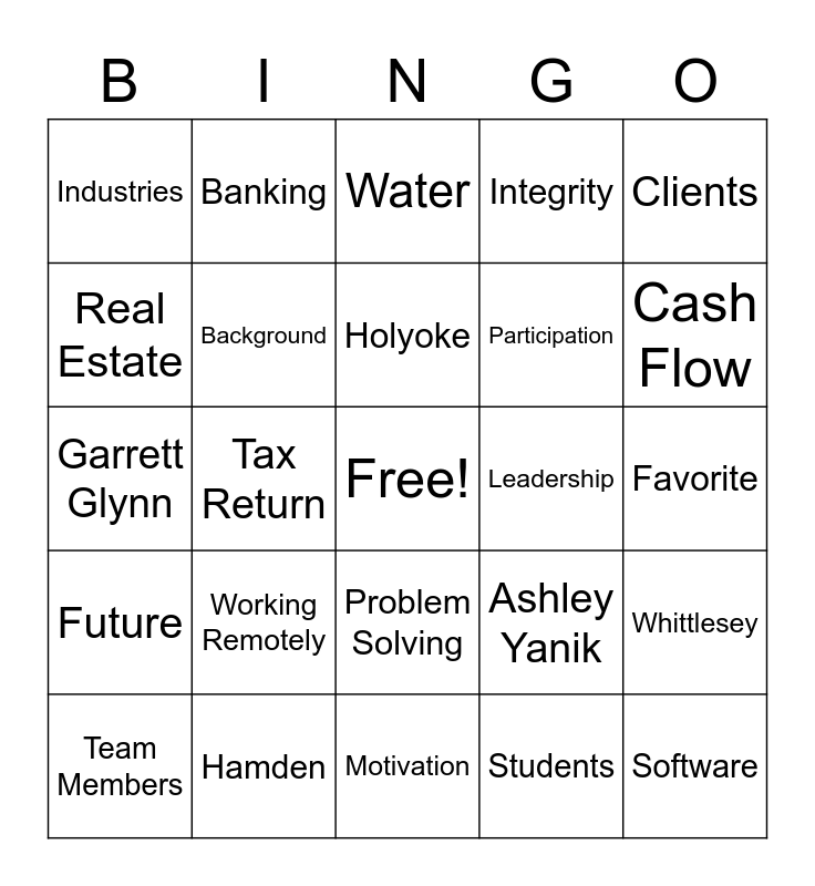 This bingo card has a free space and 24 words: Working Remotely, Hamden, Holyoke, Team Members, Clients, Industries, Real Estate, Banking, Leadership, Problem Solving, Participation, Garrett Glynn, Ashley Yanik, Whittlesey, Background, Students, Favorite, Water, Cash Flow, Tax Return, Software, Future, Integrity and Motivation.