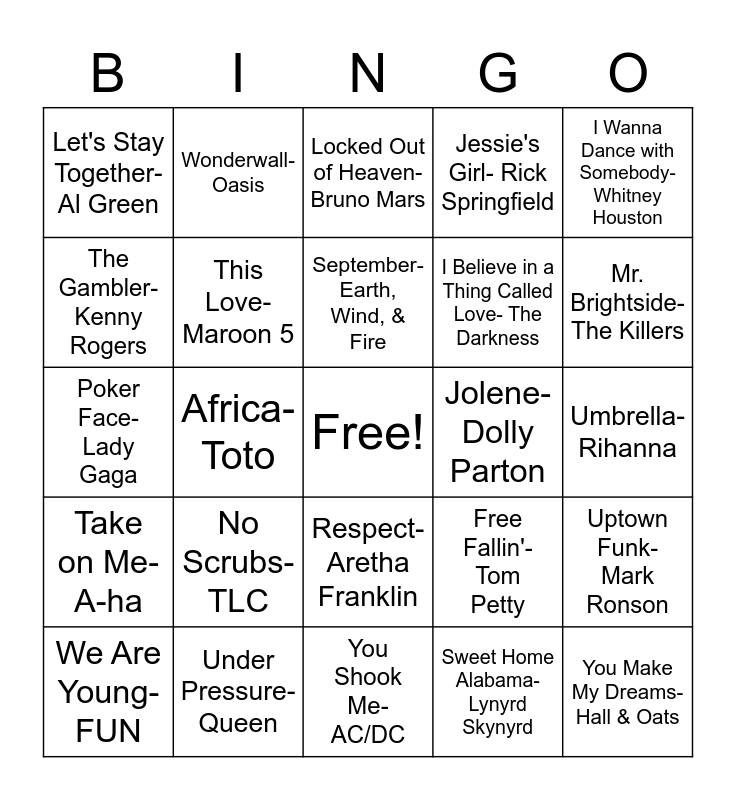This bingo card has a free space and 24 words: No Scrubs- TLC, Under Pressure- Queen, September- Earth, Wind, & Fire, We Are Young- FUN, I Wanna Dance with Somebody- Whitney Houston, Let's Stay Together- Al Green, The Gambler- Kenny Rogers, Wonderwall- Oasis, Jolene- Dolly Parton, Respect- Aretha Franklin, I Believe in a Thing Called Love- The Darkness, Poker Face- Lady Gaga, Free Fallin'- Tom Petty, Uptown Funk- Mark Ronson, This Love- Maroon 5, Sweet Home Alabama- Lynyrd Skynyrd, Umbrella- Rihanna, Locked Out of Heaven- Bruno Mars, Mr. Brightside- The Killers, Africa- Toto, You Make My Dreams- Hall & Oats, Take on Me- A-ha, Jessie's Girl- Rick Springfield and You Shook Me- AC/DC.