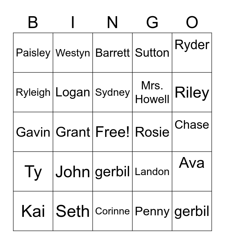 This bingo card has a free space and 24 words: Kai, John, Sydney, Penny, Ryder, Paisley, Westyn, Barrett, Rosie, Chase, Gavin, Logan, Landon, Ava, Ryleigh, Seth, Corinne, Sutton, Riley, Ty, Grant, gerbil, Mrs. Howell and gerbil.