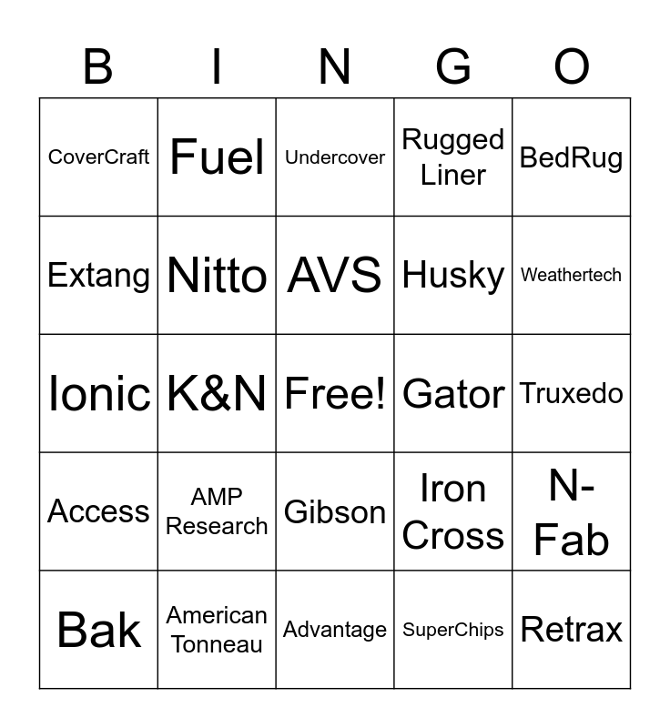 This bingo card has a free space and 24 words: AMP Research, American Tonneau, AVS, Bak, BedRug, CoverCraft, Extang, Fuel, Gator, Gibson, Husky, Ionic, Iron Cross, N-Fab, Nitto, SuperChips, Truxedo, Undercover, Weathertech, K&N, Retrax, Access, Rugged Liner and Advantage.
