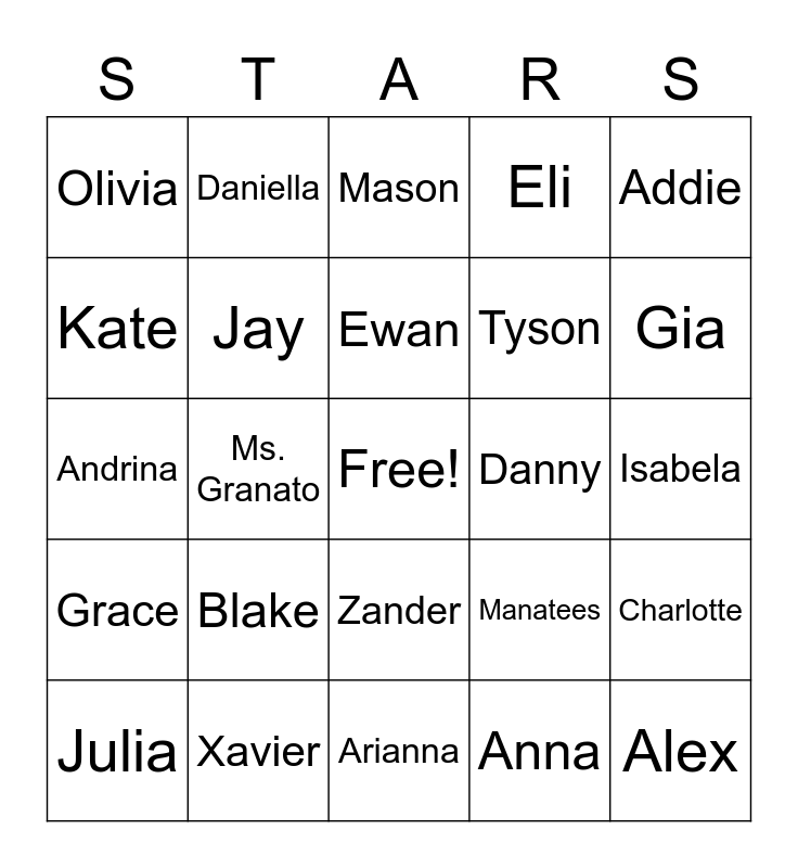This bingo card has a free space and 24 words: Blake, Xavier, Ewan, Julia, Addie, Olivia, Kate, Daniella, Danny, Zander, Tyson, Andrina, Manatees, Charlotte, Jay, Anna, Isabela, Mason, Gia, Ms. Granato, Alex, Grace, Eli and Arianna.