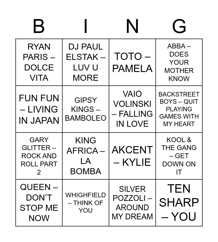 This bingo card has 34 words: KRYSTAL KLEAR – NEUTRON DANCE, MADONNA – LA ISLA BONITA, BRITNEY SPEARS – OVERPROTECTED, STARS ON 45 – STARS ON 45, TEN SHARP – YOU, VAIO VOLINSKI – FALLING IN LOVE, FUN FUN – LIVING IN JAPAN, ALPHAVILLE – BIG IN JAPAN, DJ PAUL ELSTAK – LUV U MORE, SEAN PAUL – GIMME THE LIGHT, BACKSTREET BOYS – QUIT PLAYING GAMES WITH MY HEART, TOTO – PAMELA, CHIPZ – 1001 ARABIAN NIGHTS, ANDERS NILSEN – SALSA TEQUILA, WHIGHFIELD – THINK OF YOU, KING AFRICA – LA BOMBA, HANSON – MMMBOP, AKCENT – KYLIE, MICHEL TELO – AI SE EU TE PEGO, WES – ALANE, S CLUB 7 – BRING IT ALL BACK, MIRANDA – VAMOS A LA PLAYA, RYAN PARIS – DOLCE VITA, SILVER POZZOLI – AROUND MY DREAM, KATRINA & THE WAVES – WALKING ON SUNSHINE, QUEEN – DON’T STOP ME NOW, ABBA – DOES YOUR MOTHER KNOW, BLUE SWEDE, BJORN SKIFFS – HOOKED ON A FEELING, GARY GLITTER – ROCK AND ROLL PART 2, GIPSY KINGS – BAMBOLEO, LIPPS INC. – FUNKY TOWN, KOOL & THE GANG – GET DOWN ON IT, DIANA ROSS – I’M COMING OUT and EARTH, WIND & FIRE – LET’S GROOVE.