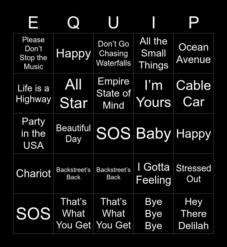 This bingo card has 175 words: equip, Macarena, YMCA, We Are Family, Happy, Can’t Stop the Feeling, Hey Ya!, I Like to Move It, All Star, Baby, Stayin’ Alive, Who Let the Dogs Out, Party in the USA, Nobody’s Perfect, SOS, Bye Bye Bye, Backstreet’s Back, Kung Fu Fighting, Mirrors, Lucky, ABC-123, Stand by Me, Beautiful People, Shake It Off, 22, Sadie Hawkins Dance, Dancing Queen, Stronger, Cable Car, You Found Me, Levels, Apologize, Counting Stars, Count on Me, Don’t You Worry Child, Lights, What Makes You Beautiful, Pompeii, Fly Me to the Moon, Symphony, Bohemian Rhapsody, Viva la Vida, Every Teardrop is a Waterfall, Chasing Cars, Sweet Caroline, You are the Best Thing, Radioactive, Unwritten, Haven’t Met You Yet, Check Yes Juliet, Beautiful Day, Firework, I’m Yours, Halo, No One, Empire State of Mind, Fly Me to the Moon, I Don’t Wanna Be, Hey Soul Sister, Drops of Jupiter, Chariot, Please Don’t Stop the Music, Stressed Out, Forever, A Thousand Miles, Rolling in the Deep, Classic, The Great Escape, Move Along, That’s What You Get, Time of Your Life, Sk8er Boi, Ocean Avenue, Hey There Delilah, I Gotta Feeling, All of Me, Life is a Highway, 19 You and Me, Parachute, Thrift Shop, Ice Ice Baby, Bills Bills Bills, Don’t Go Chasing Waterfalls, 1,2 Step, The Spaceman, Jump Around, Souldja Boy, All the Small Things, Macarena, YMCA, We Are Family, Happy, Can’t Stop the Feeling, Hey Ya!, I Like to Move It, All Star, Baby, Stayin’ Alive, Who Let the Dogs Out, Party in the USA, Nobody’s Perfect, SOS, Bye Bye Bye, Backstreet’s Back, Kung Fu Fighting, Mirrors, Lucky, ABC-123, Stand by Me, Beautiful People, Shake It Off, 22, Sadie Hawkins Dance, Dancing Queen, Stronger, Cable Car, You Found Me, Levels, Apologize, Counting Stars, Count on Me, Don’t You Worry Child, Lights, What Makes You Beautiful, Pompeii, Fly Me to the Moon, Symphony, Bohemian Rhapsody, Viva la Vida, Every Teardrop is a Waterfall, Chasing Cars, Sweet Caroline, You are the Best Thing, Radioactive, Unwritten, Haven’t Met You Yet, Check Yes Juliet, Beautiful Day, Firework, I’m Yours, Halo, No One, Empire State of Mind, Fly Me to the Moon, I Don’t Wanna Be, Hey Soul Sister, Drops of Jupiter, Chariot, Please Don’t Stop the Music, Stressed Out, Forever, A Thousand Miles, Rolling in the Deep, Classic, The Great Escape, Move Along, That’s What You Get, Time of Your Life, Sk8er Boi, Ocean Avenue, Hey There Delilah, I Gotta Feeling, All of Me, Life is a Highway, 19 You and Me, Parachute, Thrift Shop, Ice Ice Baby, Bills Bills Bills, Don’t Go Chasing Waterfalls, 1,2 Step, The Spaceman, Jump Around, Souldja Boy and All the Small Things.