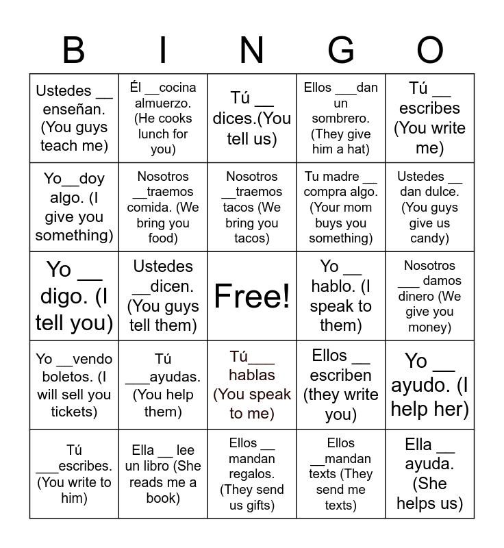 This bingo card has a free space and 26 words: Tú___ hablas (You speak to me), Ellos __mandan texts (They send me texts), Nosotros __traemos tacos (We bring you tacos), Ella __ lee un libro (She reads me a book), Tú __ escribes (You write me), Ustedes __ enseñan. (You guys teach me), Yo__doy algo. (I give you something), Él __cocina almuerzo. (He cooks lunch for you), Nosotros ___ damos dinero (We give you money), Ellos __ escriben (they write you), Tu madre __ compra algo. (Your mom buys you something), Yo __ digo. (I tell you), Yo __ ayudo. (I help her), Tú ___escribes. (You write to him), Ustedes __dicen. (You guys tell them), Yo __traigo un gato.(I bring her a cat), Ellos ___dan un sombrero. (They give him a hat), Yo __vendo boletos. (I will sell you tickets), Tú __ dices.(You tell us), Ella __ ayuda.(She helps us), Ustedes __ dan dulce. (You guys give us candy), Ellos __ mandan regalos. (They send us gifts), Yo __ hablo. (I speak to them), Tú ___ayudas. (You help them), Nosotros __traemos comida. (We bring you food) and Yo__compro un perro. (We buy you a dog).