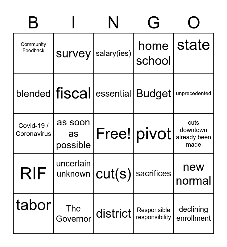 This bingo card has a free space and 24 words: uncertain unknown, The Governor, essential, tabor, state, Community Feedback, blended, survey, pivot, cut(s), Budget, Covid-19 / Coronavirus, sacrifices, new normal, fiscal, Responsible responsibility, cuts downtown already been made, salary(ies), unprecedented, as soon as possible, declining enrollment, RIF, home school and district.