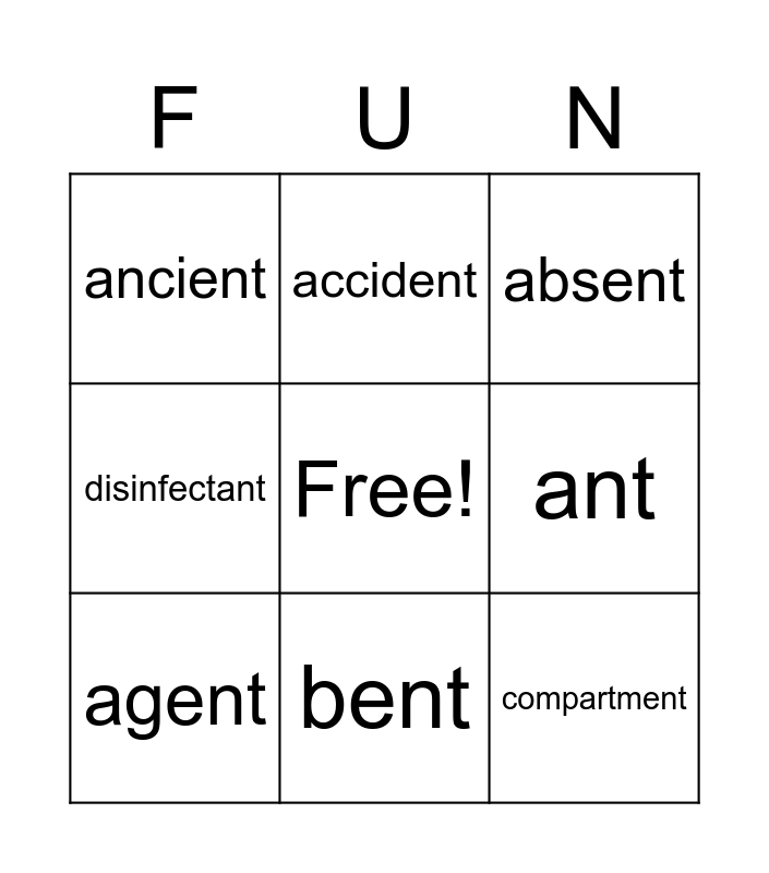 This bingo card has a free space and 8 words: ant, absent, accident, agent, ancient, compartment, disinfectant and bent.