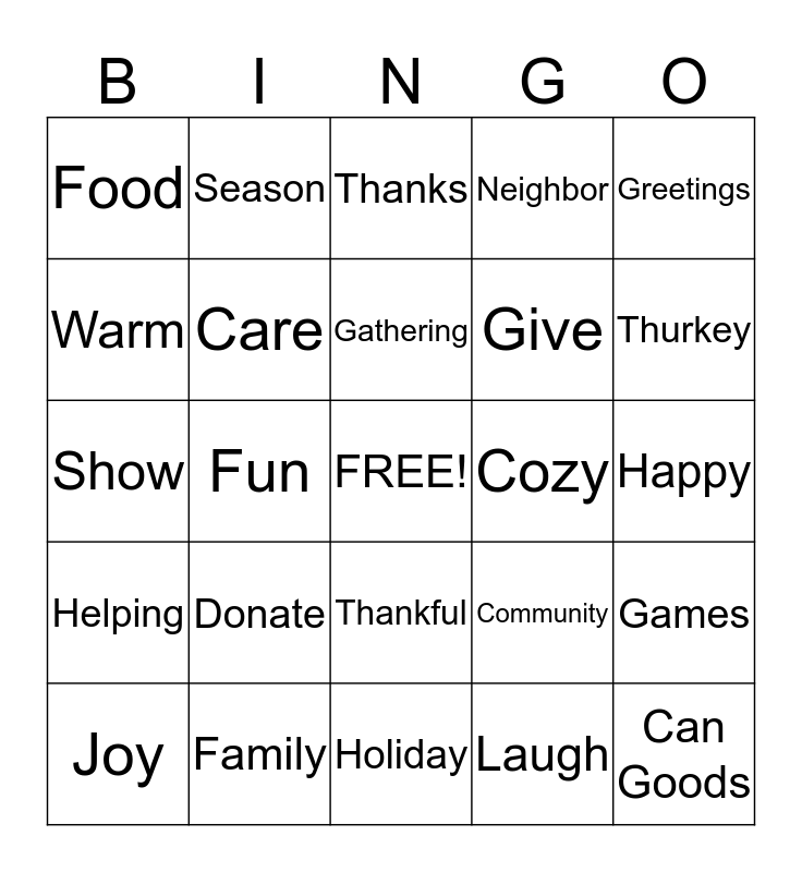 This bingo card has a free space and 24 words: Donate, Family, Gathering, Joy, Greetings, Food, Warm, Season, Cozy, Thankful, Give, Show, Community, Games, Care, Laugh, Happy, Thanks, Thurkey, Fun, Can Goods, Helping, Neighbor and Holiday.