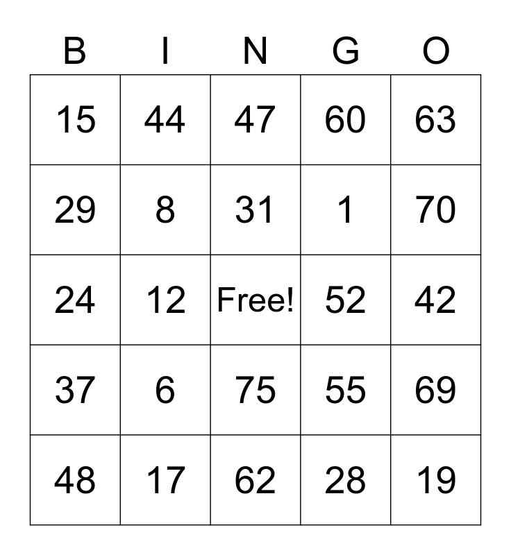 This bingo card has a free space and 24 words: 6, 17, 31, 48, 63, 15, 29, 44, 52, 75, 1, 24, 55, 69, 8, 28, 42, 47, 70, 12, 19, 37, 60 and 62.