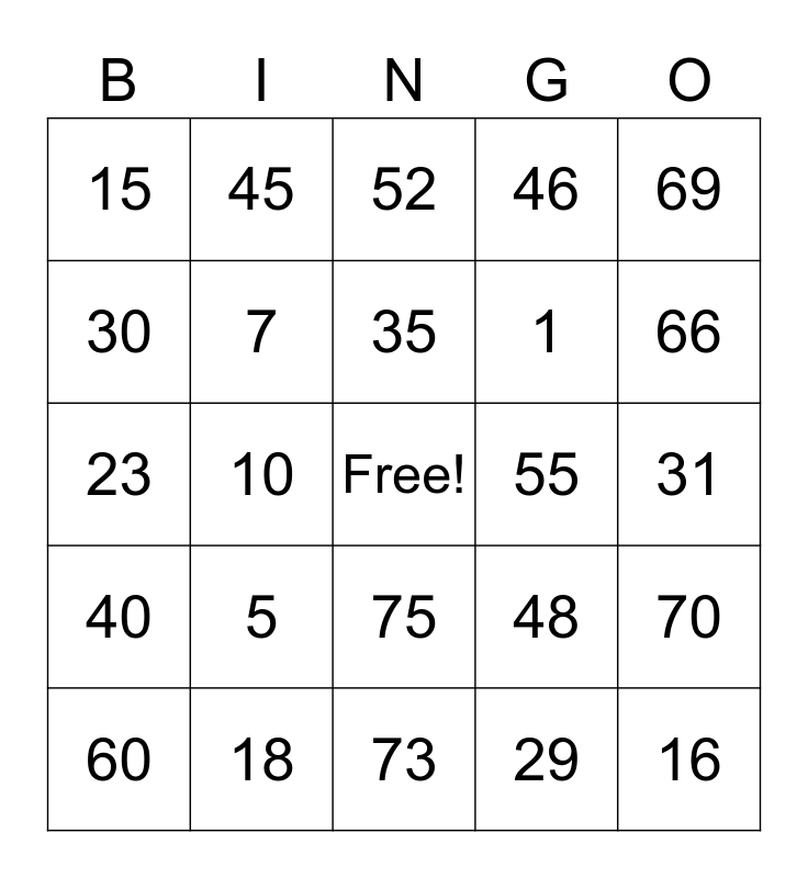 This bingo card has a free space and 24 words: 5, 18, 35, 60, 69, 15, 30, 45, 55, 75, 1, 23, 48, 70, 7, 29, 31, 52, 66, 10, 16, 40, 46 and 73.